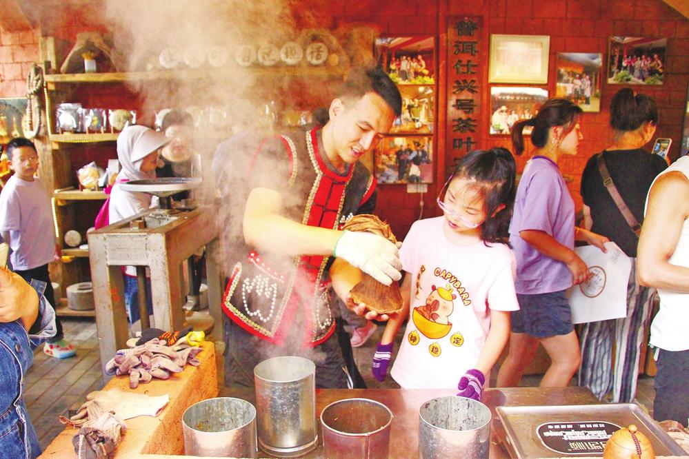 游客在普洱市仕兴号茶叶农民合作社学习制作贡茶 本报记者 高玥 摄